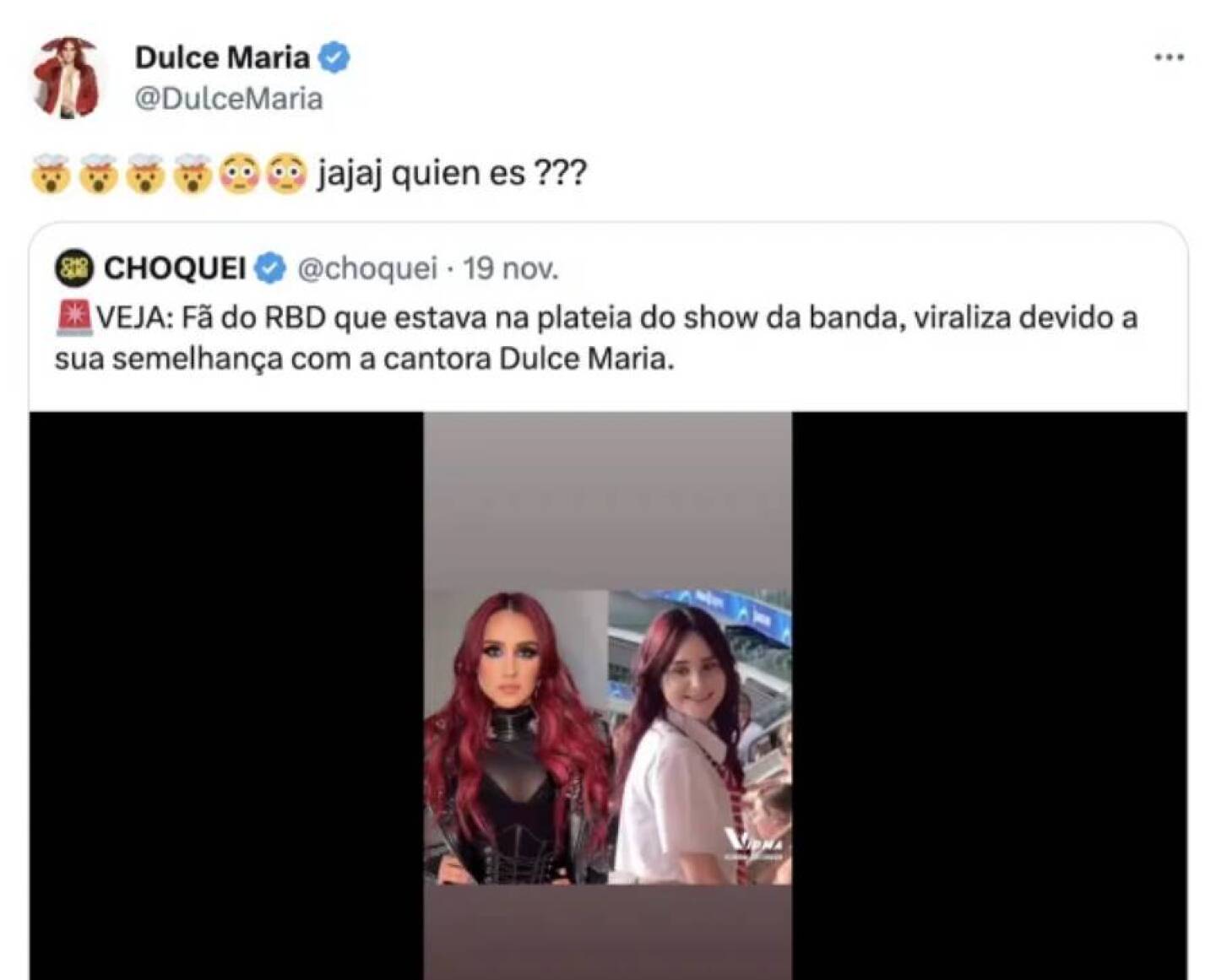 La reacción de los fans no se hizo esperar, pero la que más llamó la atención fue la reacción de la propia Dulce María que preguntó por su “hermana gemela pérdida”.