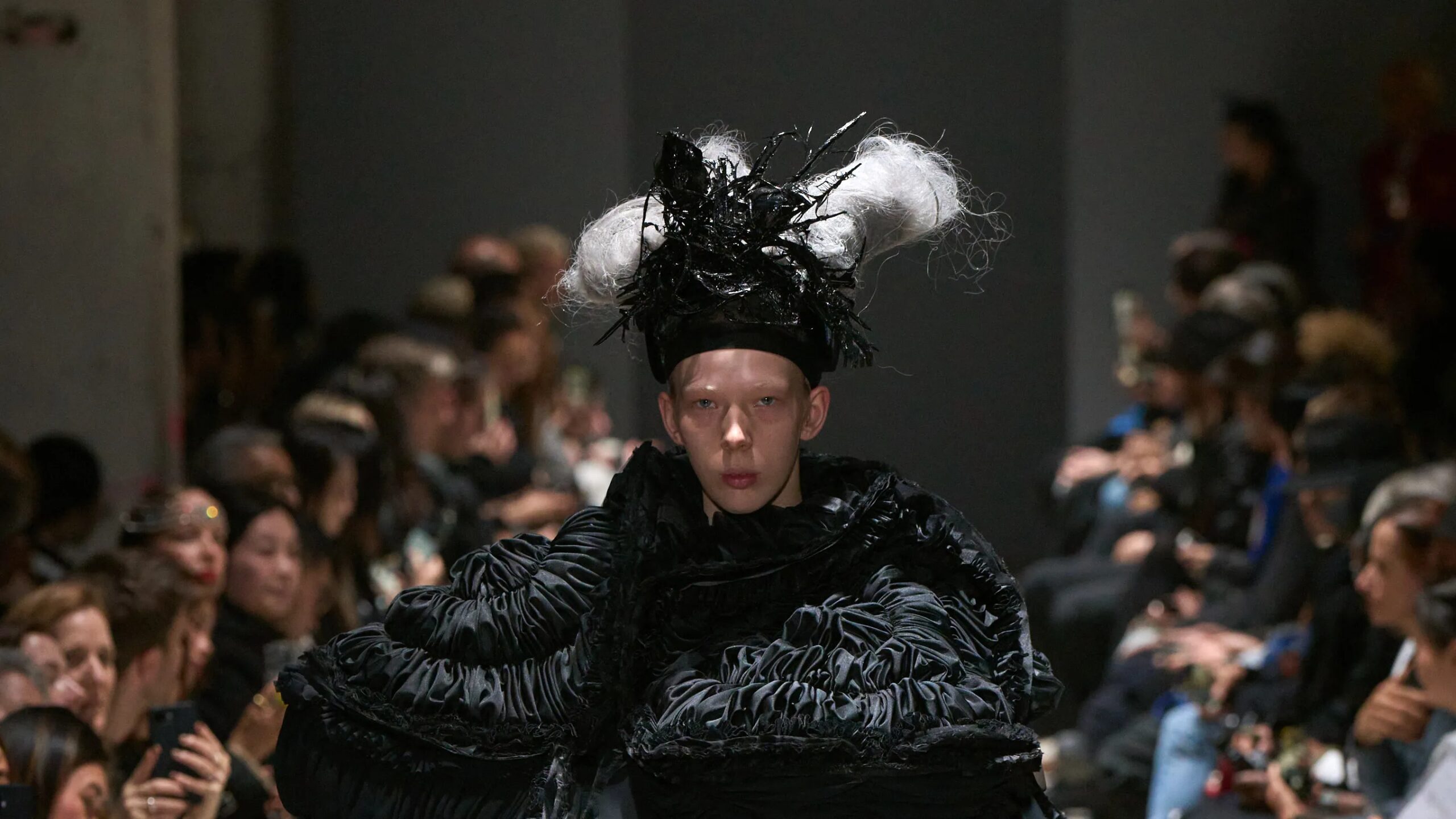 En comparación con la anterior colección de ropa de mujer, donde se abrazaban formas Brutalistas con pinceladas gruesas, la arquitectura de esta presentación introdujo un nuevo contraste: detalles sutiles en medio de la oscuridad. Elementos como el shirring, movimiento en los tejidos y capas de tul con bordados finos aportaron textura a las piezas, que, a su vez, desafiaban la definición convencional del diseño.
