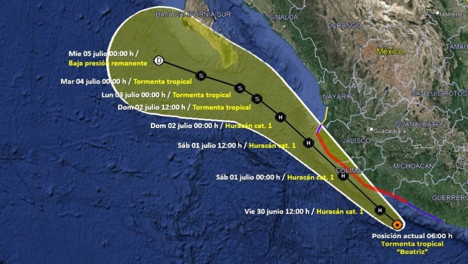 (CNN Español) — La tormenta tropical Beatriz, formada el jueves 29 de junio frente a las costas del occidente de México, en el océano Pacífico, se desplaza hacia el oeste-noroeste a 20 km/h y llevará lluvias torrenciales a los estados de Jalisco, Colima, Michoacán y Guerrero y lluvias intensas a Oaxaca y Chiapas, según informa el Servicio Meteorológico Nacional de México.