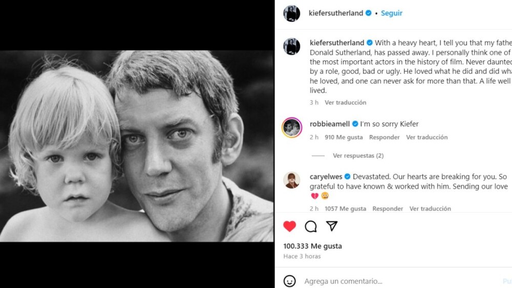En una publicación de Instagram, Kiefer lamentó: “Con gran pesar, les informo que mi padre, Donald Sutherland, ha fallecido. Personalmente, me parece uno de los actores más importantes de la historia del cine. Nunca le asustó un papel, bueno, malo o feo. Amaba lo que hacía e hizo lo que amaba, y nunca se puede pedir más que eso. Una vida bien vivida”.