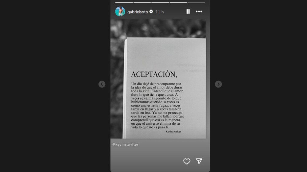 “El amor dura lo que tiene que durar. A veces se va más pronto de lo que hubiéramos querido”, se lee en el mensaje atribuido a Kevins.writer y que no tardó en viralizarse, ¿Gabriel Soto está en pleno proceso de sanación? Todo apunta a que sí.