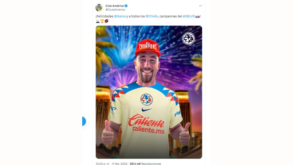 En lugar de Twittear, Las Águilas publicaron un fotomontaje de Kelce con el jersey del América y añadieron el siguiente mensaje: “¡Felicidades Travis Kelce y a todos los Chiefs, campeones del SBLVIII!”.