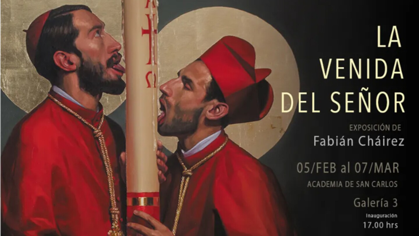 Fabián Cháirez es originario de Tuxtla Gutiérrez, Chiapas. “Vamos a ver imágenes, mundos en los que están interactuando seres fantásticos, como ángeles y el Espíritu Santo, adentrándose o siendo sometidos por monjas y cardenales”, dijo el artista a la revista Chilango al respecto de su exposición.