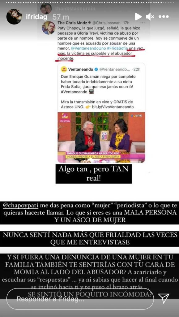 Tras la entrevista que Chapoy realizó al cantante, donde Guzmán lloró mientras negaba el abuso contra su nieta, Frida Sofía se manifestó contra la periodista.