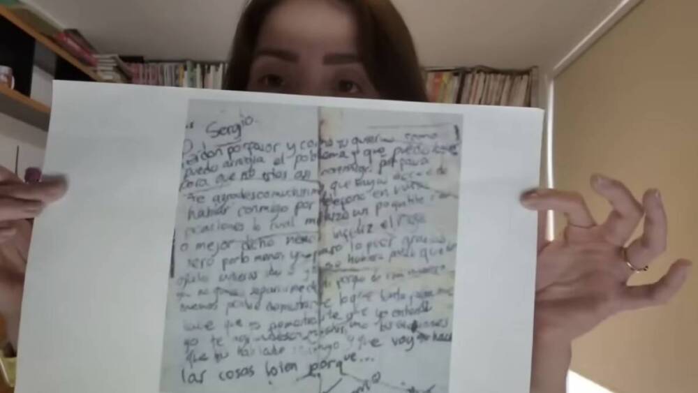 “Quiero que veamos el tamaño con el que escribe el nombre de Sergio, es mucho más grande; ahora, noten cómo es una escritura infantil porque era una persona extraordinariamente joven, era una mujer muchísimo más joven que Sergio Andrade”, comenzó a explicar Maryfer sobre la carta escrita en 1994 en un pase de abordar de United Airlines.