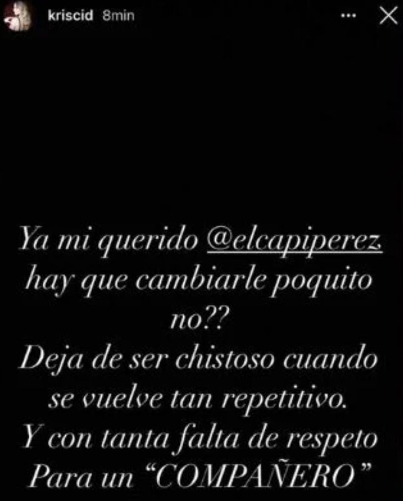 “Ya mi querido Capi Pérez, hay que cambiarle poquito ¿no? Deja de ser chistoso cuando se vuelve tan repetitivo y con tanta falta de respeto para un compañero”, escribió Kristal en una historia de instagram que luego borró.