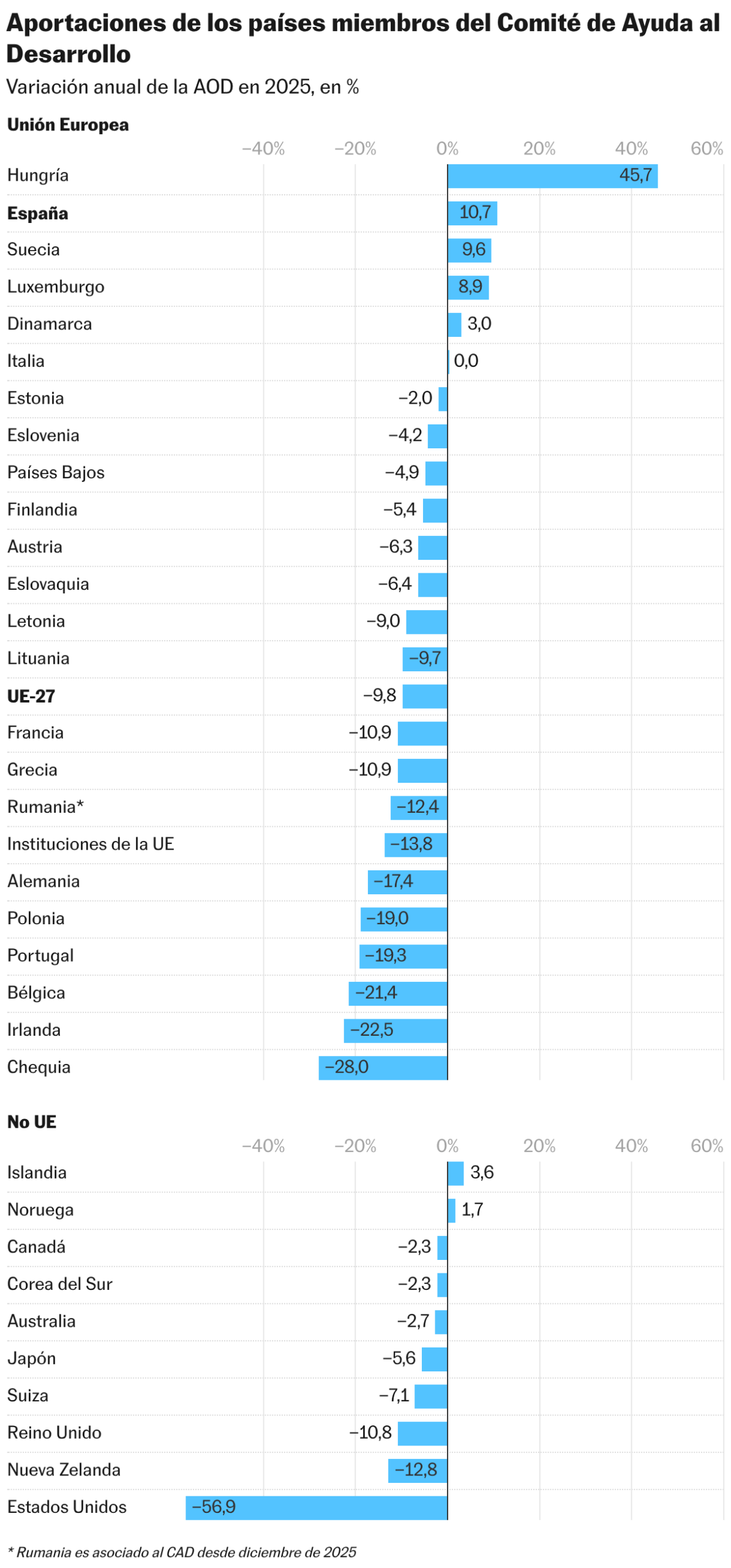 Aunque la caída fue generalizada, la OCDE destaca una fuerte concentración de los recortes. Un total de 26 de los 34 países miembros del CAD redujeron su ayuda en 2025, y solo cinco grandes donantes —Estados Unidos, Alemania, Francia, Reino Unido y Japón— explican el 95,7% del descenso total. EE UU fue el principal responsable del desplome: su ayuda oficial al desarrollo se redujo un 56,9%, lo que representa tres cuartas partes de la caída total. Según la OCDE, se trata del mayor recorte anual realizado por un solo país en toda la serie histórica.