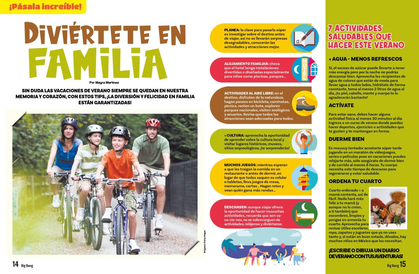 De un lado de la revista Big Bang, los niños encontrarán todo tipo de actividades, manualidades, experimentos, origami, recetas, dibujos, juegos, deportes, ideas para pasear con la familia y recomendaciones para que se diviertan y aprendan mucho en estas vacaciones de verano.