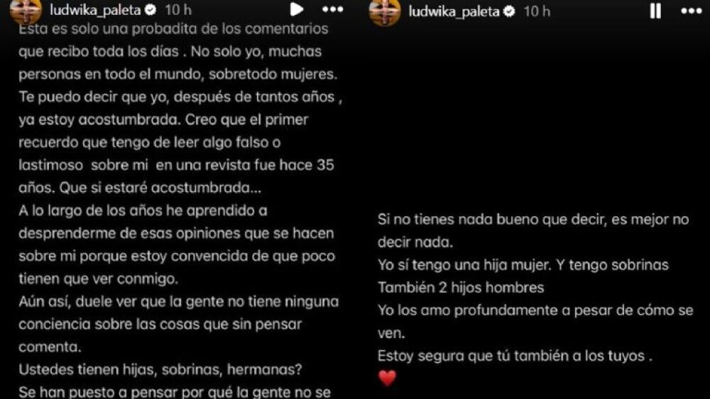 Fue a través de sus stories de Instagram que Ludwika Paleta ventiló algunos de los comentarios de odio que a diario recibe por parte de algunos usuarios de Instagram; en ellos, es común que la señalen por estar “vieja”, “gorda” o “descuidada”.