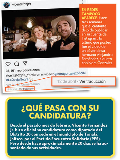Desde hace 20 días, Vicente Fernández Jr. se ha ausentado del ojo público: no ha realizado actividades de campaña, no publica nada en redes sociales y se desconoce su paradero