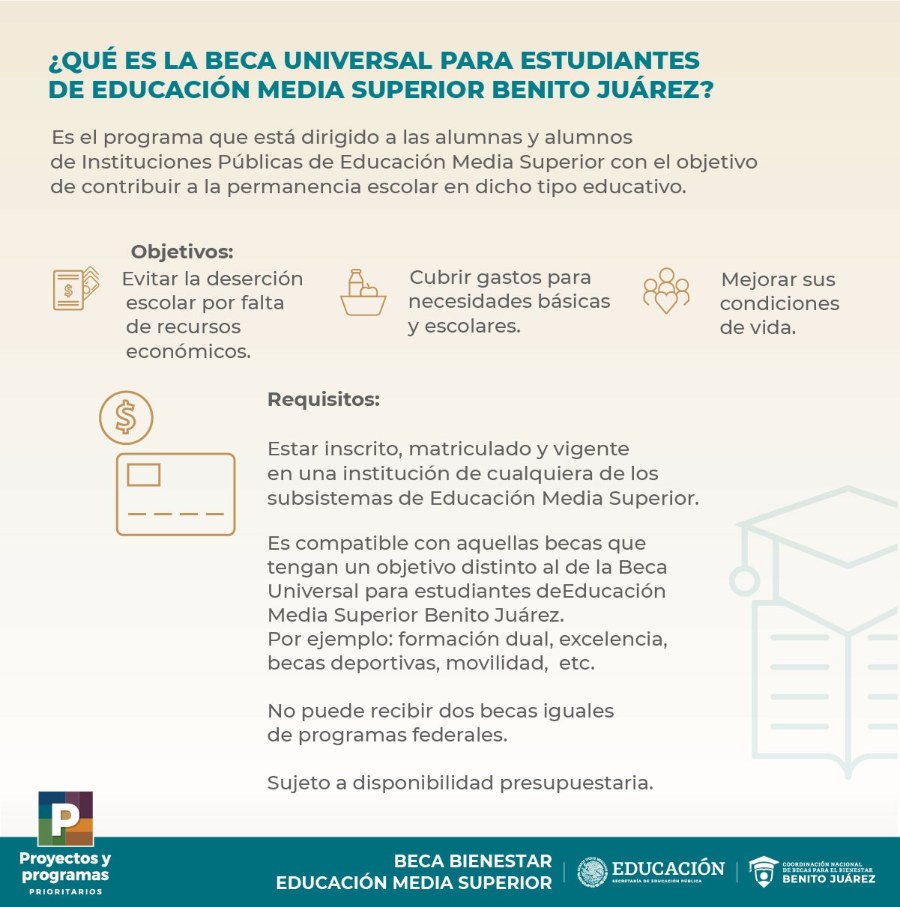 Las becas para el Bienestar Benito Juárez son un programa dirigido a los alumnos de instituciones públicas de Educación Media Superior que busca apoyarlos de manera económica para que concluyan con sus estudios, esto sin importar la modalidad en la que estén estudiando.