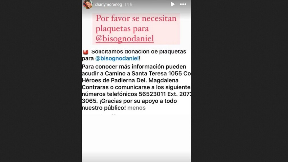 En la primera de ellas, publicada antes de la cirugía del conductor de Ventaneando, Charly Moreno publicó un desesperado llamado a donar sangre para Bisogno: “Por favor, se necesitan plaquetas para @bisognodaniel”, escribió el joven influencer.