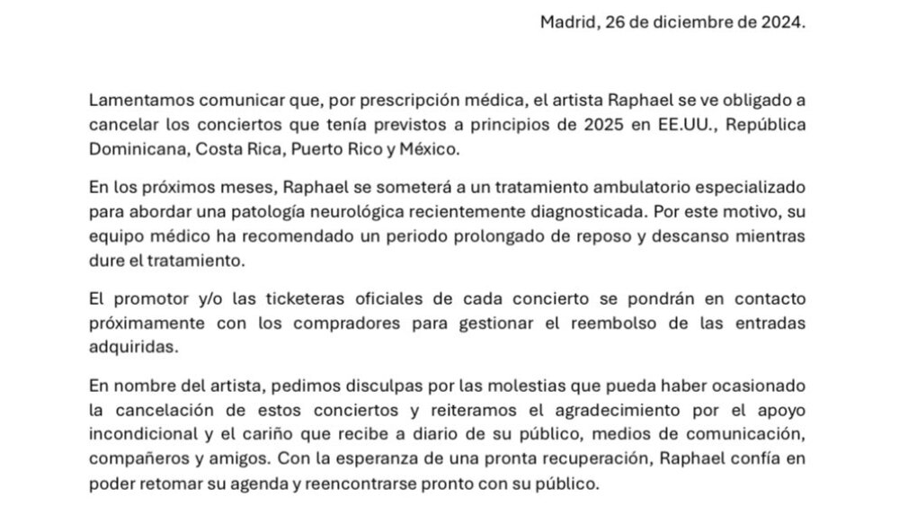 El tratamiento, aseguraron los médicos, “continuará de forma ambulatoria. Por este motivo, recibirá el alta previsiblemente en los próximos días (tal vez este viernes 27 de diciembre)”; sin embargo, ya es un hecho que la gira Victoria 2025 y que traería a Raphael a México no se realizará, pues fue cancelada de forma oficial con la promesa de que, si todo sale bien, los shows serán reagendados.