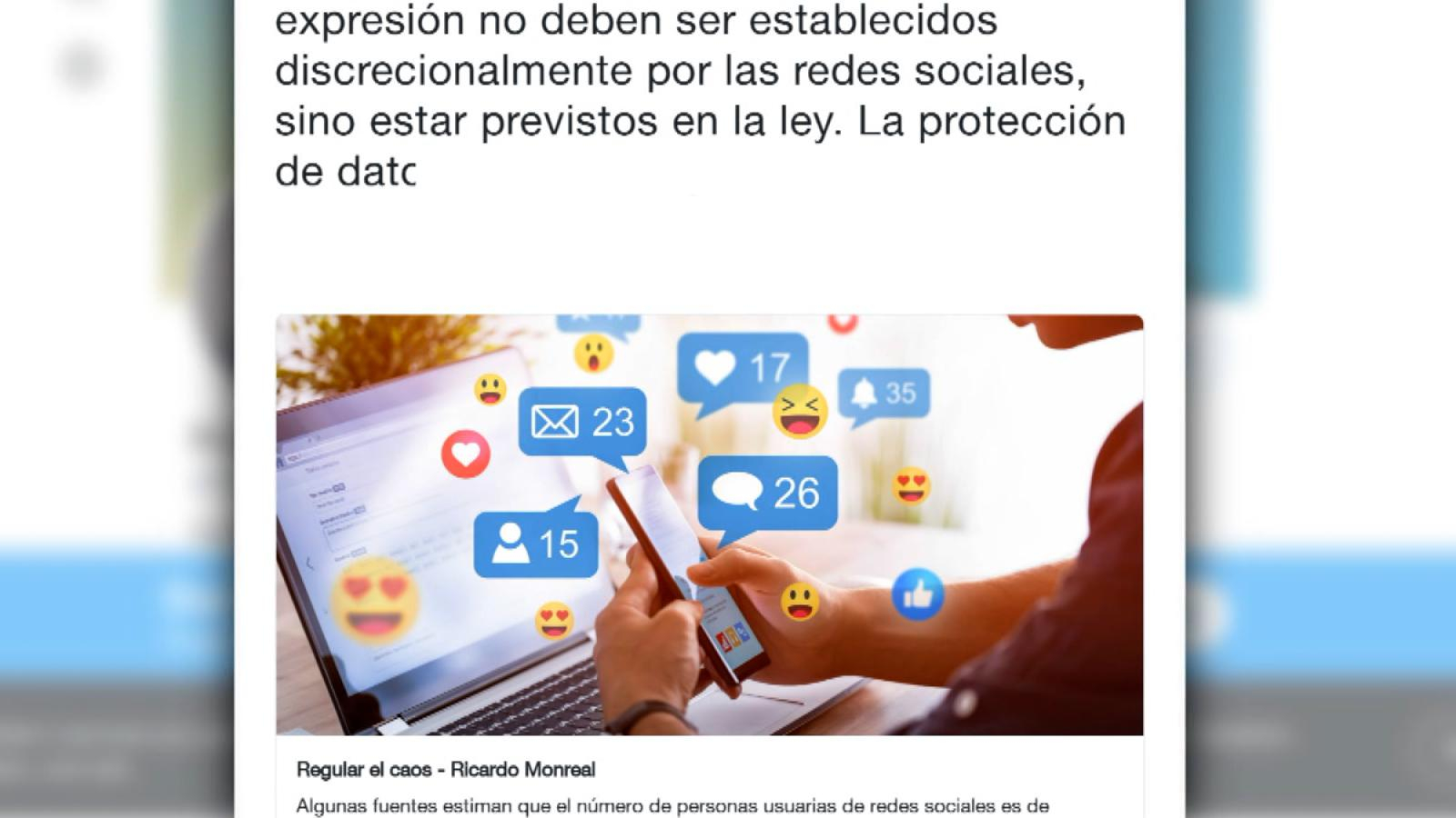 Ricardo Monreal Ávila, senador de Morena —mayoría en la Cámara Alta de México— dice a CNN que presentará una iniciativa de ley para regular a las redes sociales en informacion.center. Monreal Ávila considera que corresponde a los legisladores, y no a las empresas de redes sociales, proteger el derecho a la información y la libertad de expresión. «Si en este momento Twitter o deciden cancelar una cuenta y eliminar el contenido, no hay ningún recurso de defensa del usuario» para revertir esa decisión, dijo el senador mexicano.