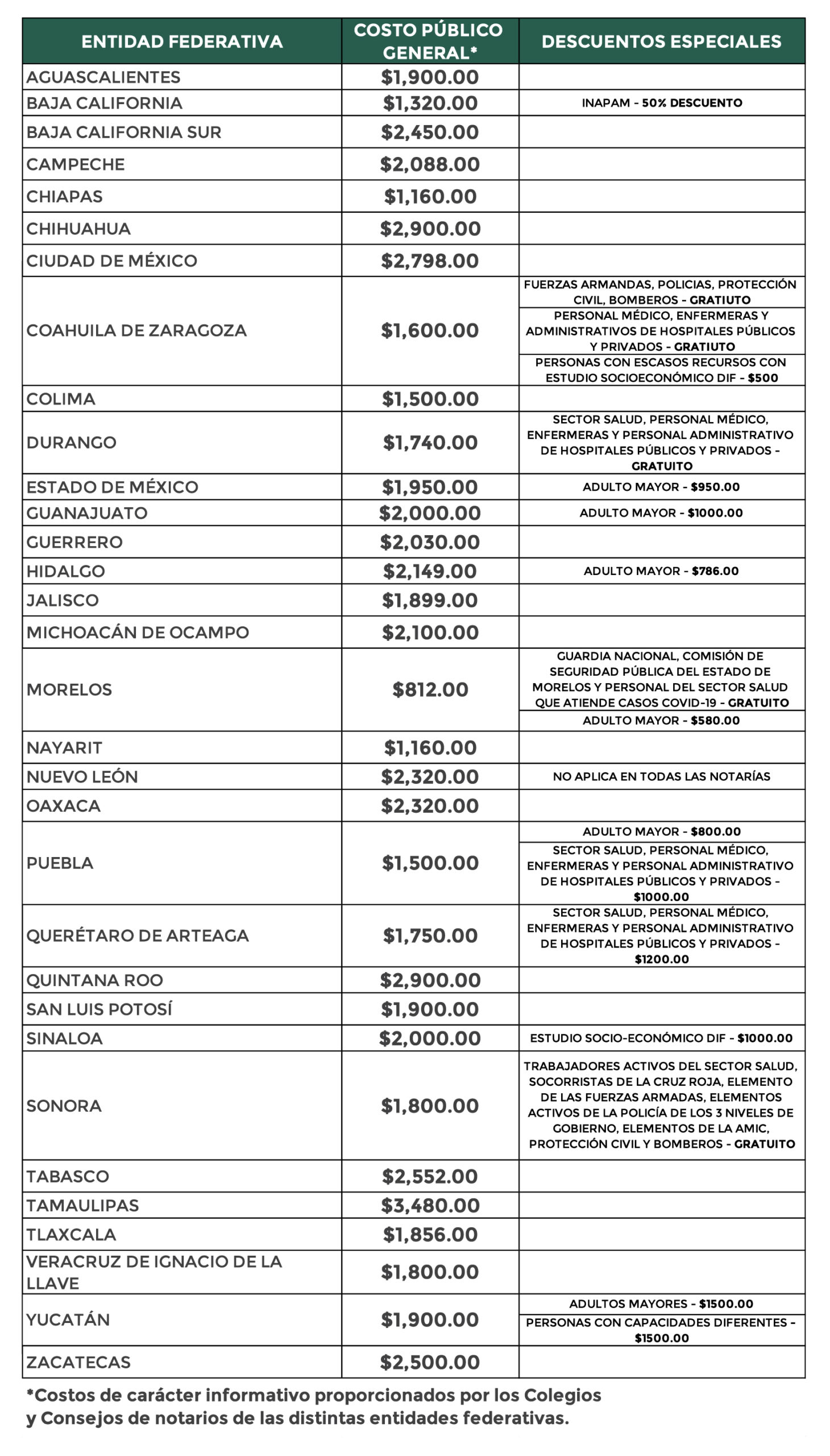 El testamento es un instrumento muy importante, sin embargo, se estima que al menos 90 millones de mexicanos morirán sin haber realizado debidamente este documento. Dependiendo de la entidad, los costos de este trámite van de los 1,300 pesos a los 2,300. En la Ciudad de México, por lo general, el costo del testamento universal es de 1,630 pesos, pero durante el mes de septiembre este precio tendrá un descuento de 50%. Además, las personas mayores de 64 años tienen un precio preferencial de manera permanente de 540 pesos.