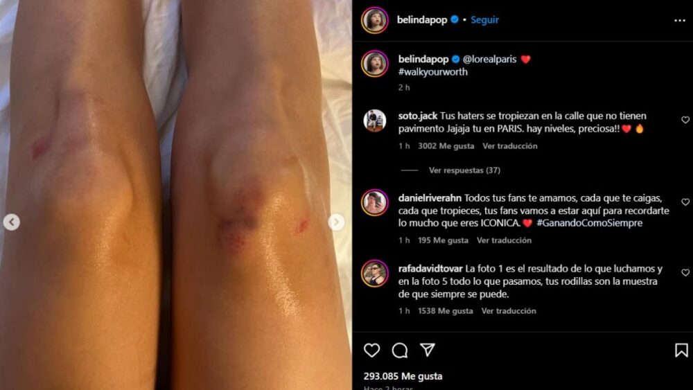 Sobre el momento que vivió Belinda en el backstage todavía se sabe poco, pero sabemos que compartió una foto de sus rodillas y algunos moretones que le provocó la caída.
